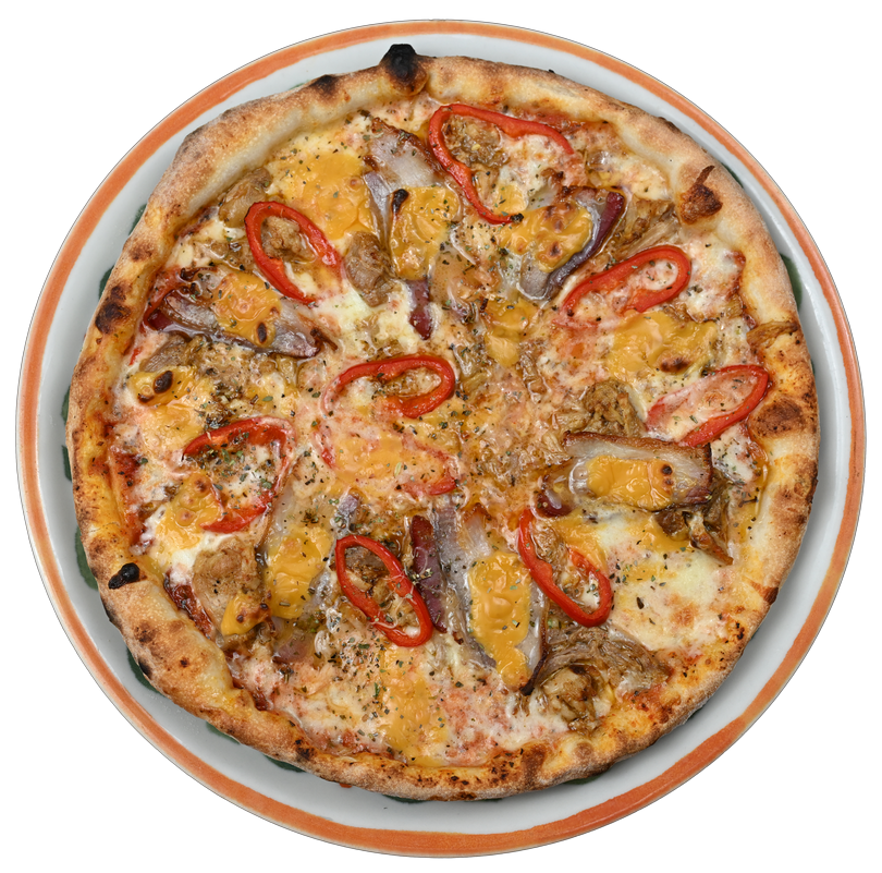 Pelat, meso od cepkanog praseta, slaninica, čedar, kačkavalj, paprika, karamelozovani luk, origano.