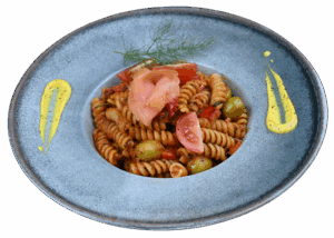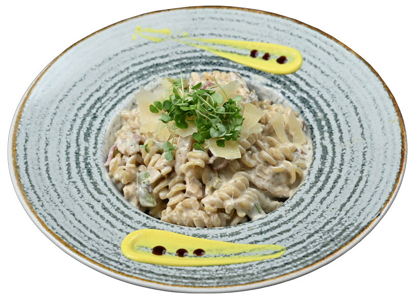 Fusili, pileći file, pršuta, šampinjoni,grilovana tikvica, začini, parmezan.