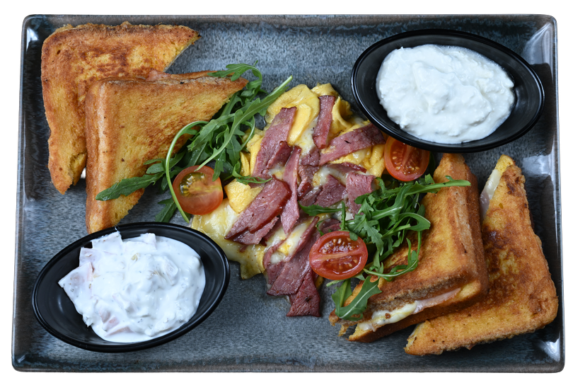 Grilovana dimljena junetina, mocarela, pohovani hleb punjen francuskom salatom i kačkavaljem, omlet od jednog jajeta, 2 kriške starog sira, gorgonzola sir, krem sir, zelena salata, čeri paradajz.