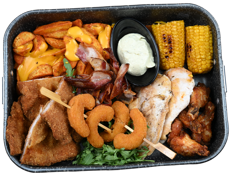 Pohovane svinjske šnicle, grilovani pileći file, pohovani račići, rskava krilca, pekarski krompir sa topljenim čedarom, kukuruz, grilovana slaninica.