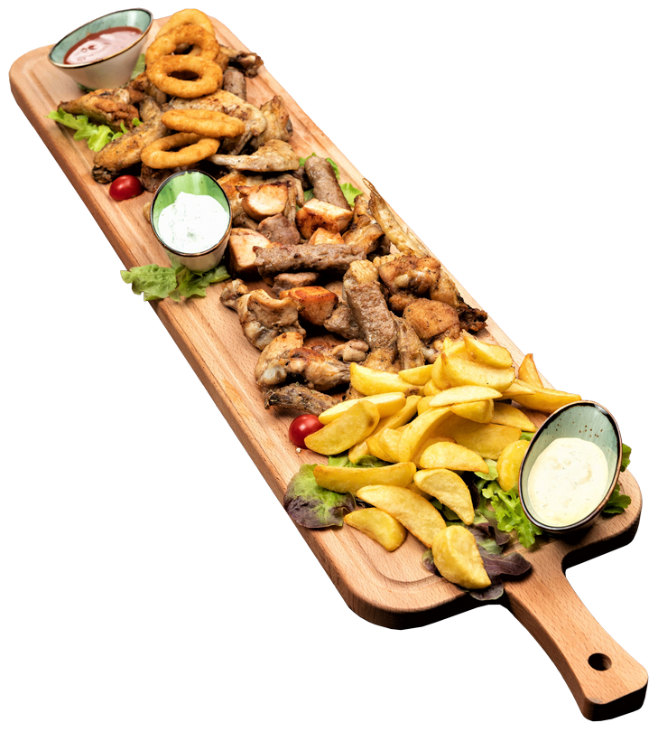 Bečka šnicla, ćevapi od junećeg mesa I klase, pileći file, dimljeni svinjski vrat, rskava krilca, pohovani luk, pekarski krompir.