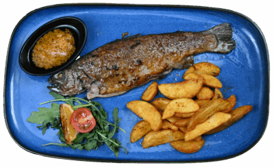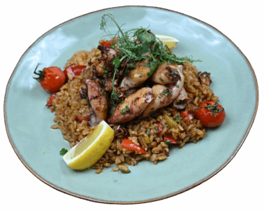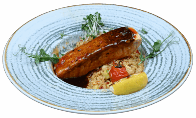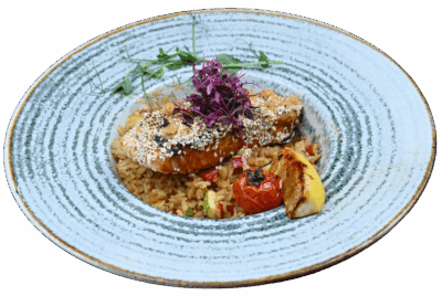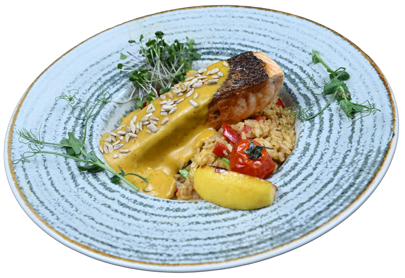 Grilovani filet lososa, rižoto, med-senf sos, suncokret, čeri paradajz.