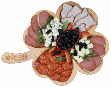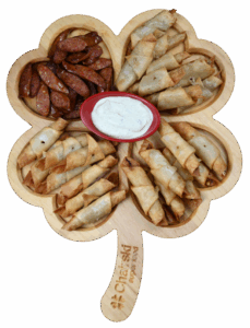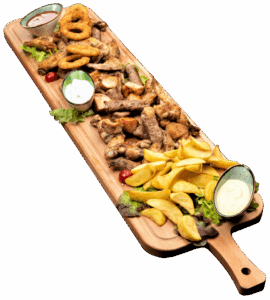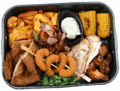Pohovana piletina u susamu, pohovani škampi, pileći prstići, suva šljiva grilovana u slaninici, pohovani luk, pomfrit, belolučeni pekarski krompir. Prilozi: kečap, tartar i beli sos.