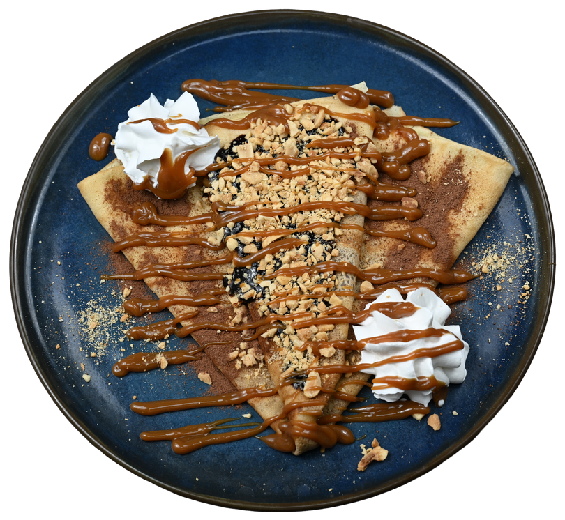 Čokoladni krem, neskvik, seckani kikiriki, plazma, toping od karamele.