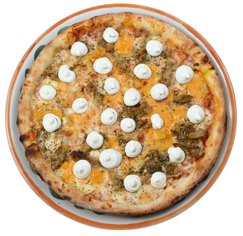 Pelat, meso od cepkanog pileta, čedar, kačkavalj, beli sos, origano.