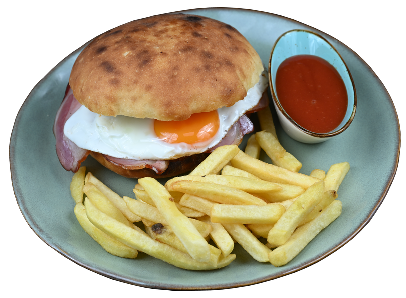 Topli somun, kajmak, svinjska pršuta, jaje. Kečap i pomfrit u prilogu.