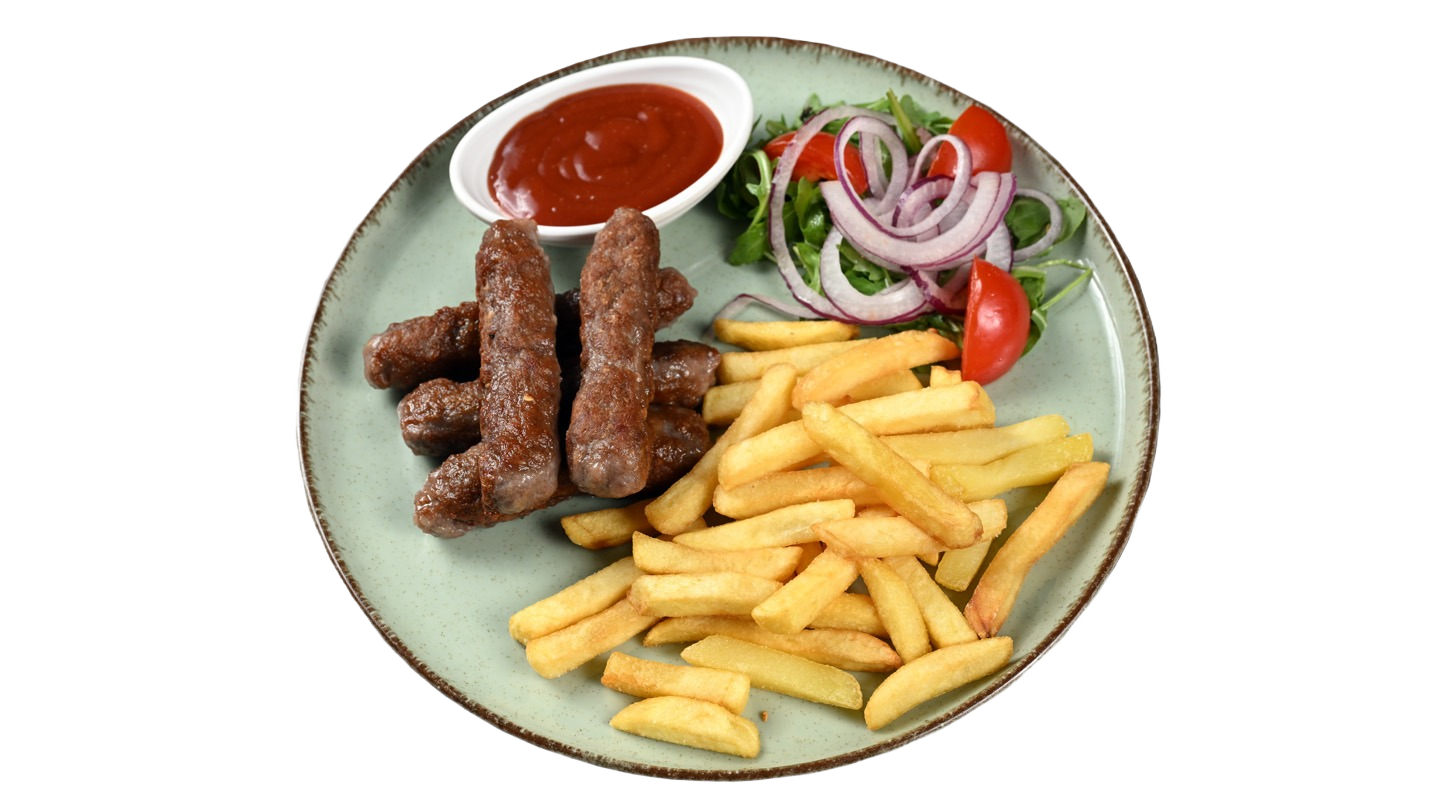 5 ćevapa od junećeg roštiljskog mesa premijum kvaliteta. Pomfrit i kečap u prilogu.