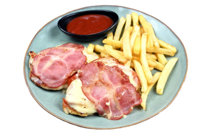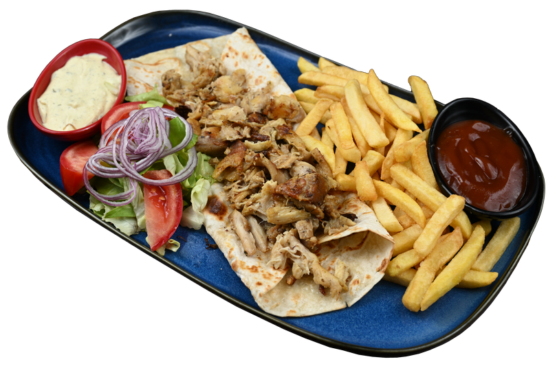 Cepkano pile na toploj tortilji, zelena salata, sveži krastavac, paradajz, crveni luk.