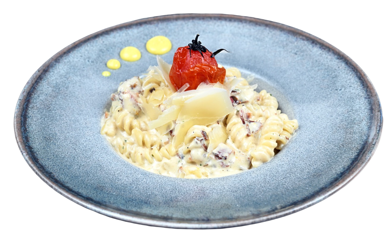 Fusili, slaninica, marinada belog luka, žumance, parmezan, čeri paradajz, začini.