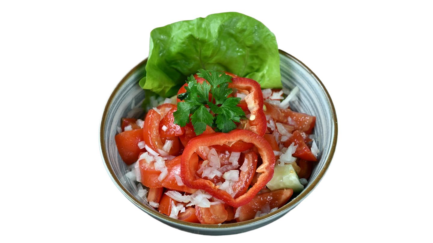 Paradajz, krastavac, crvena paprika, crni luk, ulje.
