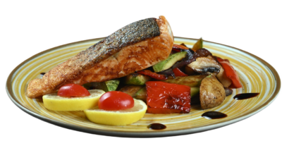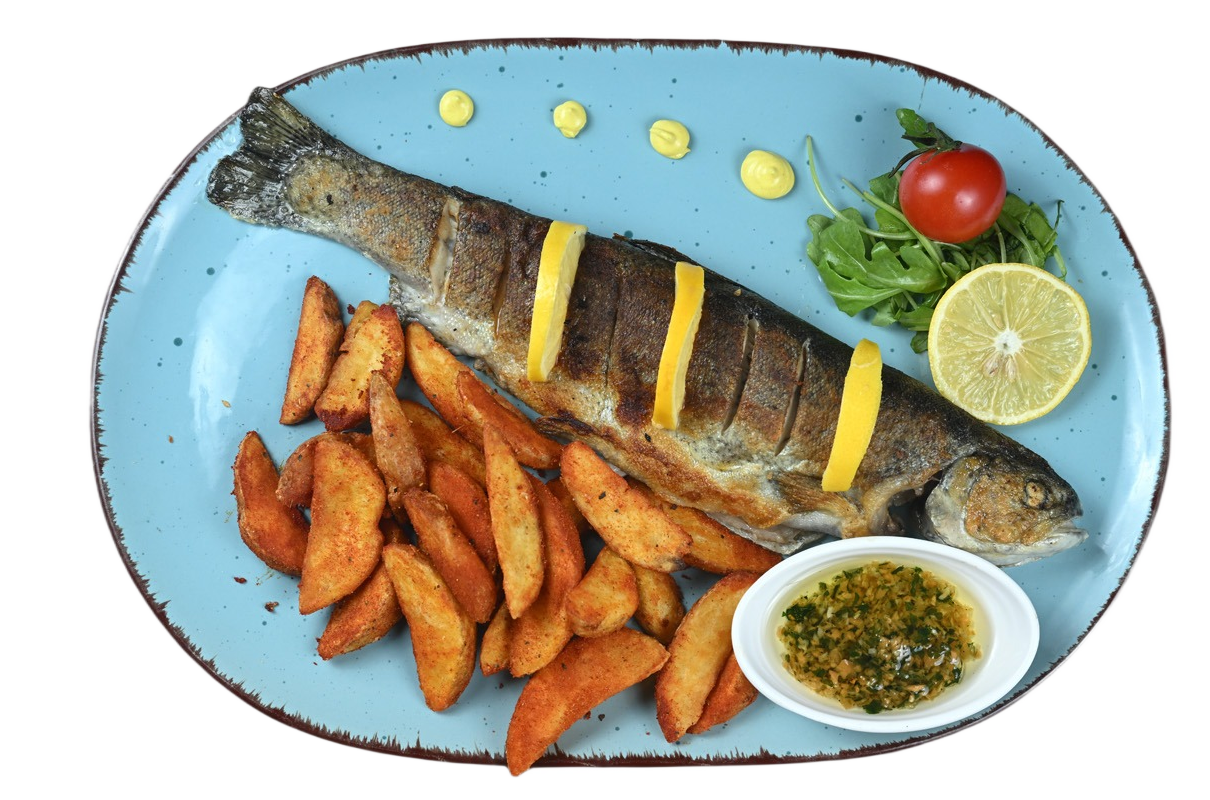 Sveža grilovana riba, sa pekarskim krompirom, paradajzom, krastavcem i marinadom sa šargarepom.