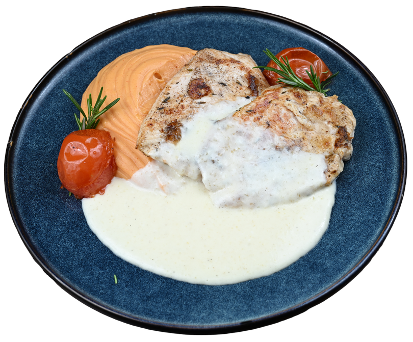 Grilovani pileći file (2x 100g) u sosu od kajmaka, parmezana i začina. Crveni pire krompir u prilogu.