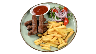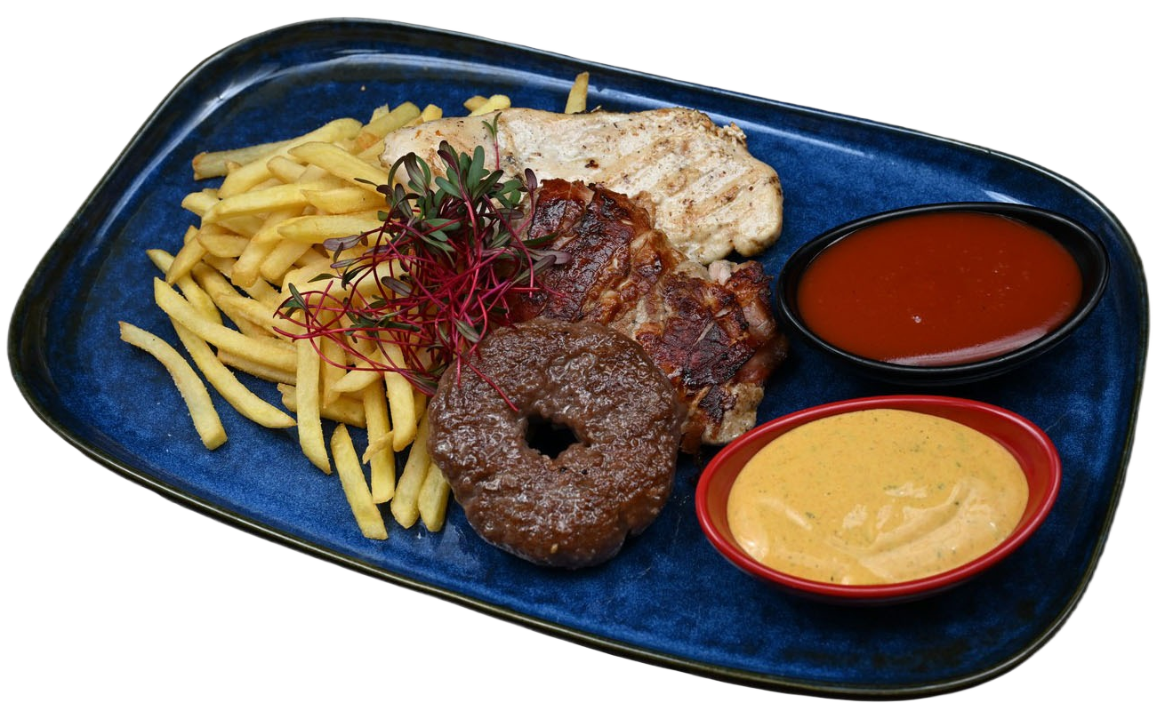 Grilovani svinjski file u slaninici, pileći file i uštipak od junećeg roštiljskog mesa premijum kvaliteta.